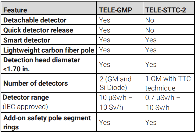 Teleskopstang i karbonfiber som sikrer god avstand til strålingskilden eller muligheten til å komme til trange rom. Artikkelen refererer kun til teleskopstangen med intern kabel og brakett for bassinstrumentet (som er avtakbar og kan brukes separat). Teleskopstangen er utformet for å passe til RDS-32 og probene GMP-12GSD/GMP-12SD. Disse bestilles separat og er ikke inkludert i varen. Sondene kan kobles fra og byttes ut om nødvendig.